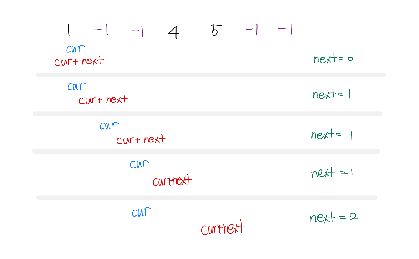 그렇게 되면 cur+next가 4를 가리키고 4는 -1도 아니므로 next를 1 증가시켜 next가 2가되고 5를 결과에 추가한다.