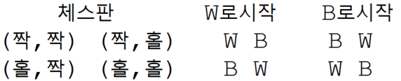 W로 시작하는 보드, B로 시작하는 보드를 미리 다 만들어 놓고 비교해도 되지만 난 그렇게 풀지는 않았다.