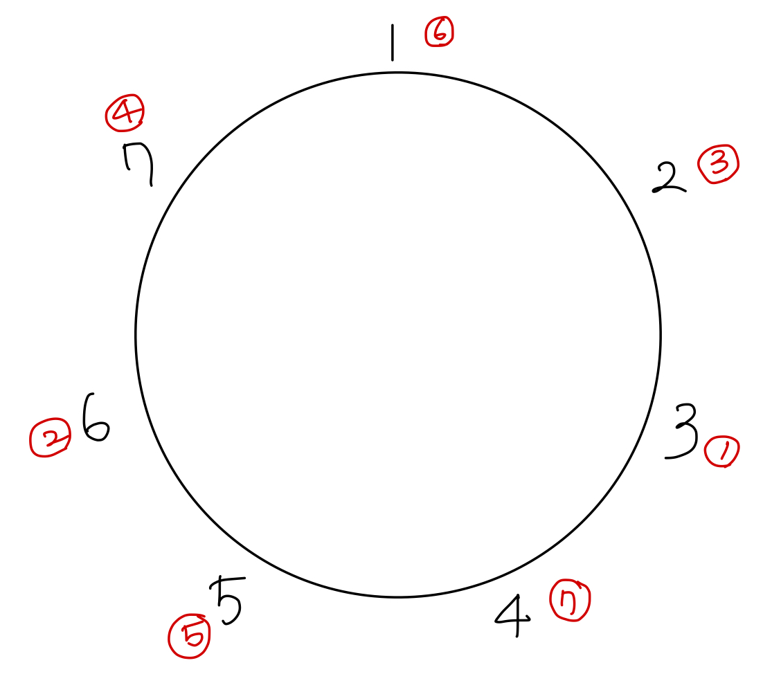나는 리스트를 이용해서, 제거된 사람을 -1로 표시하여 건너 뛰도록 하는 방법으로 구했다.