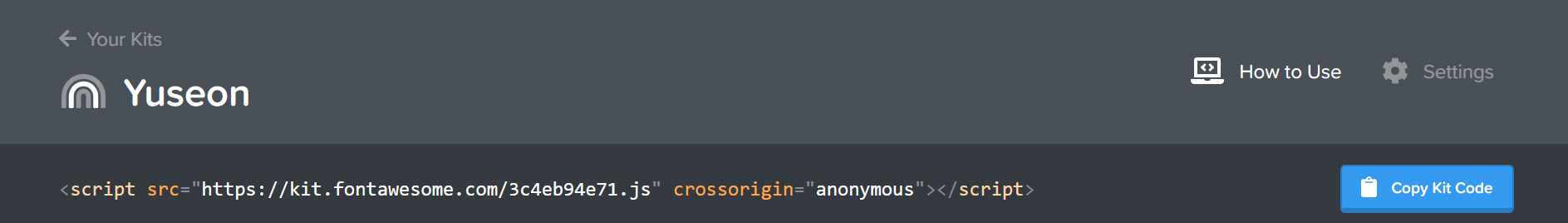 처음 만들면 e234123처럼 이상한 숫자로 된 Kit가 생성되는데, 그 아래에 있는 script코드를 사용하고자 하는 html 코드 속 <body>에 붙여 넣기 하면, Font Awesome5 내에 있는 아이콘을 사용할 수 있게 된다.